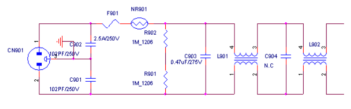 c901C902為共模電容,首要按捺差模攪擾,即前方和零線別離與地之間的攪擾。電容值愈大對低頻攪擾按捺作用愈好,在這里選用102PF /250V
