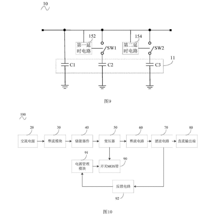 1.開關(guān)電源的啟動(dòng)電路包括:電容電路,電容電路的電容值可調(diào);和與電容電路連接的調(diào)節(jié)器件,調(diào)節(jié)器件用于在開關(guān)電源上電過程中按照設(shè)定時(shí)序調(diào)節(jié)電容電路的電容值以改變啟動(dòng)電路的電容值。電容電路包括多個(gè)電容,多個(gè)電容并聯(lián),調(diào)節(jié)器件包括開關(guān)器件,開關(guān)器件包括與多個(gè)電容連接的至少一個(gè)開關(guān)件,每個(gè)開關(guān)件與至少一個(gè)電容串聯(lián)。調(diào)節(jié)器件用于調(diào)節(jié)可調(diào)電容的電容值。