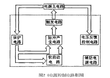 根據(jù)電路功能的分工可將控制電路分為幾大部分:脈沖產(chǎn)生電路、觸發(fā)電路、電壓反饋控制電路、軟啟動電路、保護(hù)電路、輔助電源電路等,具體控制電路如圖2-4所示。從圖2-4可以看出,脈沖產(chǎn)生電路是控制電路的核心。脈沖產(chǎn)生電路根據(jù)電壓反饋控制電路、保護(hù)電路以及軟啟動電路等提供的控制信號產(chǎn)生出所需的脈沖信號,然后該脈沖信號經(jīng)過觸發(fā)電路的放大后去驅(qū)動開關(guān)元件,使開關(guān)管導(dǎo)通或關(guān)斷。