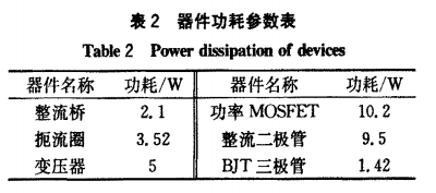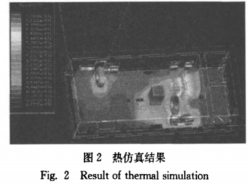 根據(jù)主要發(fā)熱元器件的損耗計(jì)算公式,得到各損耗值,將其導(dǎo)入仿真軟件;利用Ansoft仿真軟件的內(nèi)部求解器獲得實(shí)際電路的3D發(fā)熱模型,如圖2所示。從圖中可以清晰地看到電路內(nèi)部及各個元器件上的熱量分布情況。根據(jù)仿真結(jié)果(圖2)可知,功率MOSFET上的熱量和變壓器的熱量最高(紅色部分),這與從電路理論上分析求得的這兩種器件的功耗(見表2)相吻合。