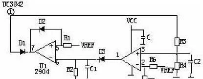 當(dāng)輸出電路短路,輸出電壓消失,光耦OT1不導(dǎo)通,UC3842①腳電壓上升至5V左右,R1與R2的分壓超過(guò)TL431基準(zhǔn),使之導(dǎo)通,UC3842⑦腳VCC電位被拉低,IC停止工作。UC3842停止工作后①腳電位消失,TL431不導(dǎo)通UC3842⑦腳電位上升,UC3842重新啟動(dòng),周而復(fù)始。當(dāng)短路現(xiàn)象消失后,電路可以自動(dòng)恢復(fù)成正常工作狀態(tài)。