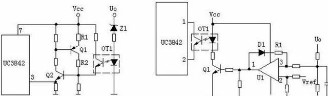 輸出限壓保護(hù)電路:輸出限壓保護(hù)電路如下圖,當(dāng)輸出電壓升高,穩(wěn)壓管導(dǎo)通光耦導(dǎo)通,Q1基極有驅(qū)動(dòng)電壓而道通,UC3842③電壓升高,輸出降低,穩(wěn)壓管不導(dǎo)通,UC3842③電壓降低,輸出電壓升高。周而復(fù)始,輸出電壓將穩(wěn)定在一范圍內(nèi)(取決于穩(wěn)壓管的穩(wěn)壓值)。