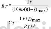 振蕩電路如圖4-3所示。UC3823A、B和UC3825A、B內部都有一個鋸齒波振蕩器。鋸齒波上升沿的斜率由RT、Cr決定,確定RT、CT的方法是:首先根據要求的最大占空比Dmax、選擇RT,再根據要求的頻率以及RT和Dmax選擇CT計算公式為:
