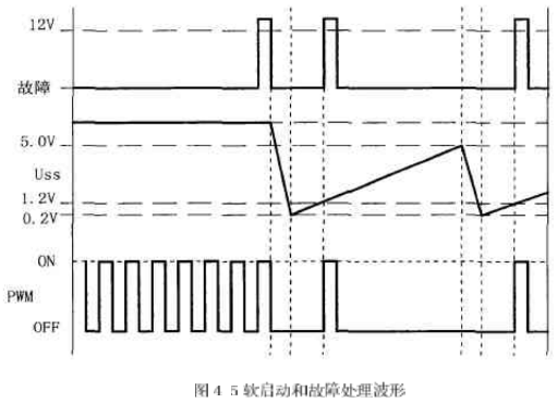 軟啟動和故障處理波形如圖4-5所示。軟啟動是通過軟啟動(SOFT,START)腳的外接電容實現的。接通電源后,軟啟動腳外接電容放電,該腳處于低電平,誤差放大器輸出低電平,開關電源無輸出電壓。當9uA的內部電流源給軟啟動腳外接電容充電時,誤差放人器輸出電壓逐漸升高,直到閉環調節功能開始T.作,開關電源輸出電壓逐漸升高到額定值。一旦限流(ILIM)腳的電平超過1.2V,故障鎖存器置位,輸出腳變為低電平;同時,軟啟動腳外接電容以250uA的電流放電。在軟啟動電容放完電后,限流腳電平降到1.2V以下時,故障鎖存器就不輸出脈沖。這時,故障鎖存器復位,芯片開始軟啟動過程。