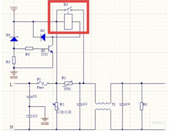 開關(guān)電源中初期階段繼電器是斷開的。當(dāng)VCC逐漸達(dá)到自身電壓的時(shí)候,穩(wěn)壓二極管D1導(dǎo)通,三極管Q1翻開,繼電器K1閉合,相當(dāng)于把限流NTC熱敏電阻R1短路。