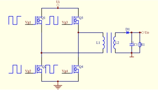 全橋式:電路由Q1、Q2、Q3、Q4組成橋式電路,如圖中所給出的信號,Q1和Q4先導(dǎo)通,Q2、Q3截止。電流流向:電源正→Q1→L1→Q4→電源負。后半周Q1、Q4截止,Q2、Q3導(dǎo)通,電流流向:電源正→Q3→L1→Q2→電源負。操控電路略微有點凌亂,需求四組不共地的驅(qū)動信號。電路不允許Q1和Q2一同導(dǎo)通,也不允許Q3和Q4一同導(dǎo)通,一同導(dǎo)公例意味著電源短路,Q1、Q2、Q3、Q4會炸飛的。一同假如Q1、Q4與 Q2、Q3的導(dǎo)通時刻不對稱,那么,L1的交通電壓就會呈現(xiàn)很大的直流重量,形成磁飽滿。