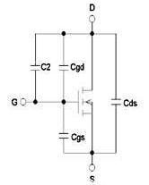 運用MOS管控制沖擊電流可以戰勝無源束縛法的缺點。MOS管有導通阻抗Rds_on低和驅動簡單的特色,在周圍加上少數元器材就可以做成沖擊電流管制電路。MOS管是電壓控制器材,其極間電容等效電路如下圖所示: