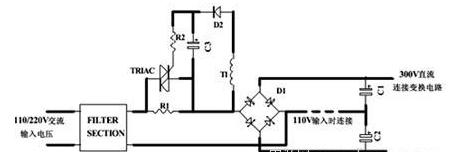上圖所示為串聯電阻法沖擊電流控制電路(適用于橋式整流和倍壓電路,其沖擊電流相同),關于110V220V雙電壓輸入電路,應該在R1R2方位放兩個電阻,這樣在110V輸入銜接線銜接時和220V輸入銜接線斷開時的沖擊電流相同大。關于單輸入電壓電路,應該在R3方位放電阻。