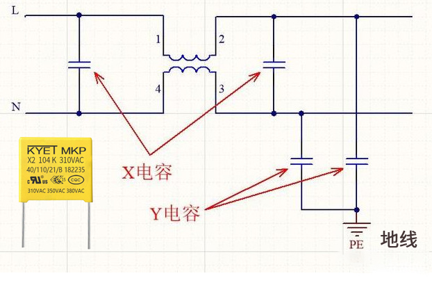 開關電源中的安規電容一般有X電容和Y電容,X電容是安裝在零線與前方之間,Y電容一般是安裝在地線與前方或地線與零線之間,具體的用法如下圖所示: