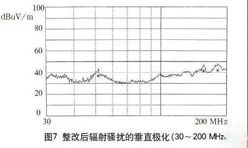 而且為了減少因變壓器側注冊時電流瞬間突變產生的didt煩擾,在變壓器T1的 側串進1個電感,以減小器件的注冊損耗,下降輻射煩擾信號。經過整改后,輻射煩擾大大下降,再次對本電源輻射煩擾進行檢驗,完全達到了標準要求,其檢驗效果如圖7所示。