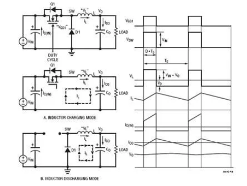 其間TON是開關電源周期TS內的導通時間間隔。假設TON/TS之比定義為占空比D,則輸出電壓VO為: