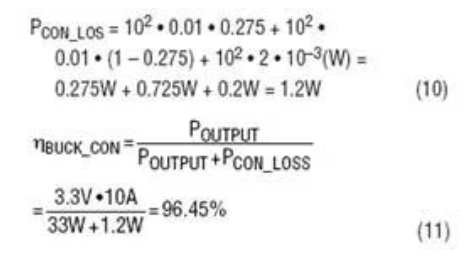 例如,12V輸入、3.3V/10AMAX輸出降壓電源可使用以下元件:MOSFET RDS(ON) = 10mΩ,電感RDCR = 2 mΩ,二極管正向電壓VD = 0.5V。因而,滿負載下的傳導損耗為: