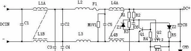 ② R1、R2、R3、Z1、C6、Q1、Z2、R4、R5、Q2、RT1、C7組成抗浪涌電路。在起機的瞬間,由于C6的存在Q2不導(dǎo)通,電流經(jīng)RT1構(gòu)成回路。當C6上的電壓充至Z1的穩(wěn)壓值時Q2導(dǎo)通。假如C8漏電或后級電路短路現(xiàn)象,在起機的瞬間電流在RT1上產(chǎn)生的壓降增大,Q1導(dǎo)通使Q2沒有柵極電壓不導(dǎo)通,RT1將會在很短的時間焚毀,以保護后級電路。